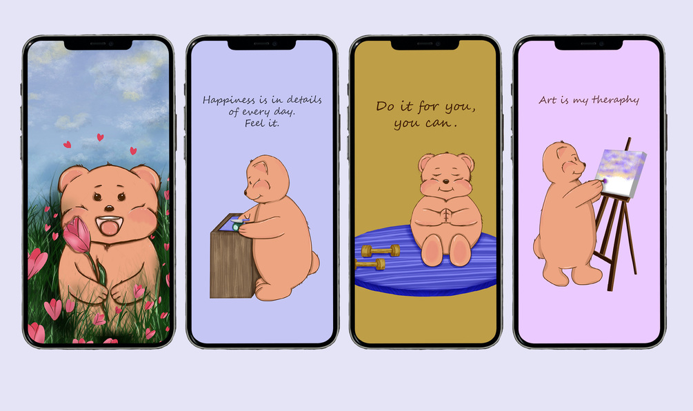 This is handmade, cute, digital illustrations for phone and PC. This is cute bears with colorful backgrounds and small positive reminders for your daily good mood. I worked about kid book Bear Boo's life, where this bear reminds and teach us, how everyday life is joyful and how we forgot it because of routine, and I took inspiration from that.